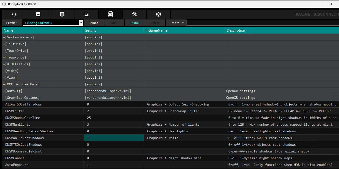 - Selecting a profile loads all the settings from \iRacingToolkit\Profiles\ into the table. If you select the iRacing Current profile it will load the current active settings directly from iRacing.